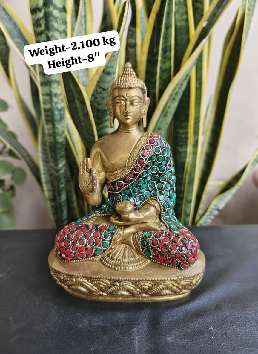 Brass Buddha Statue with Stone Work Meditating Buddha Idol
