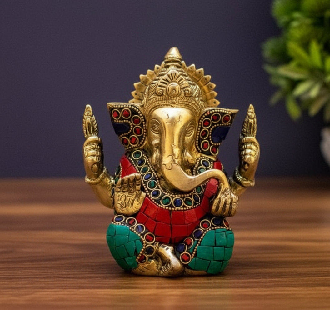 Brass Ganesh Ji Idol – Superfine Finish with Stone Work Handcrafted Vighnaharta Sculpture for Pooja & Festive Décor