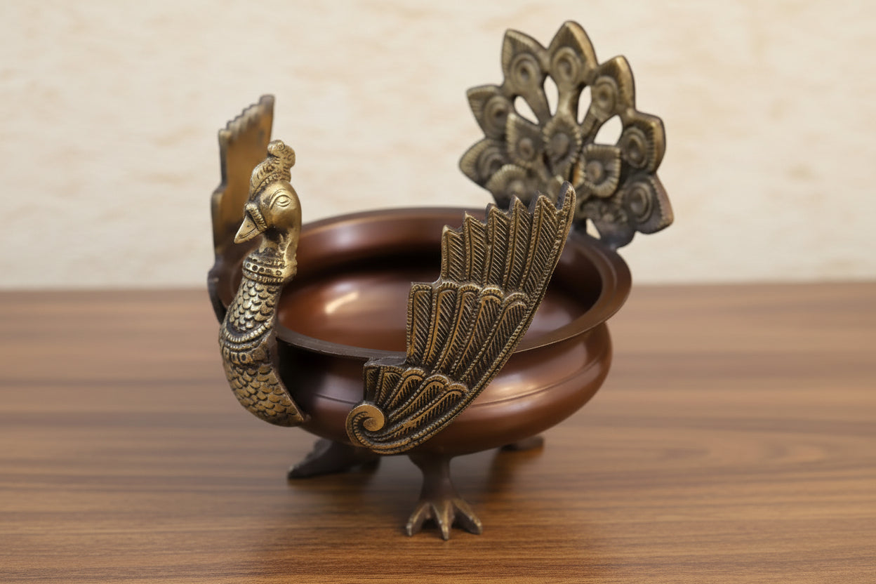 Brass Peacock Urli Bowl – Brown Finish Decorative Urli for Home Décor, Pooja & Gifting