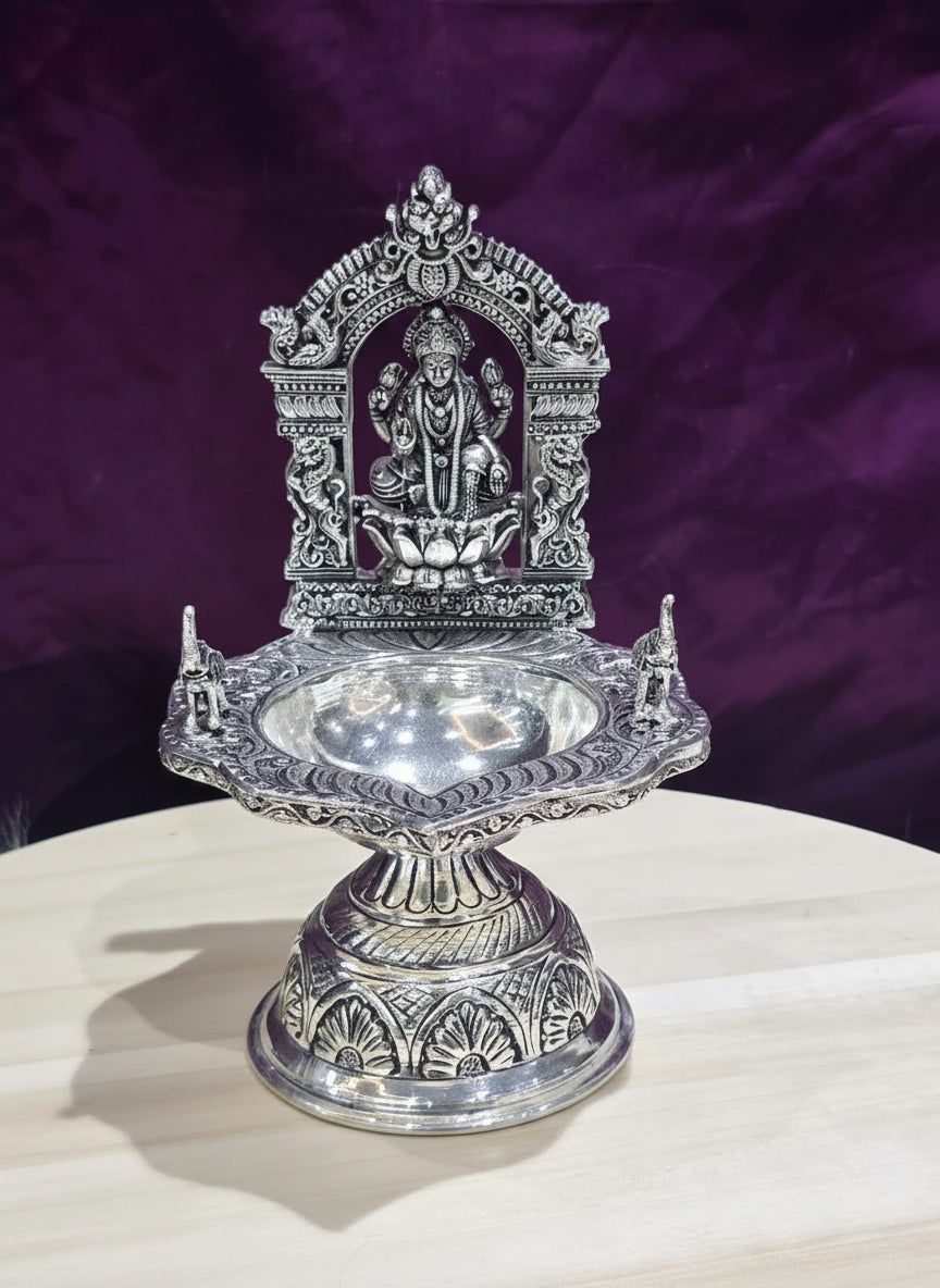 German Silver Lakshmi Diya with Elephants – Antique Finish Fully Carved Pooja Lamp for Temple & Gifting