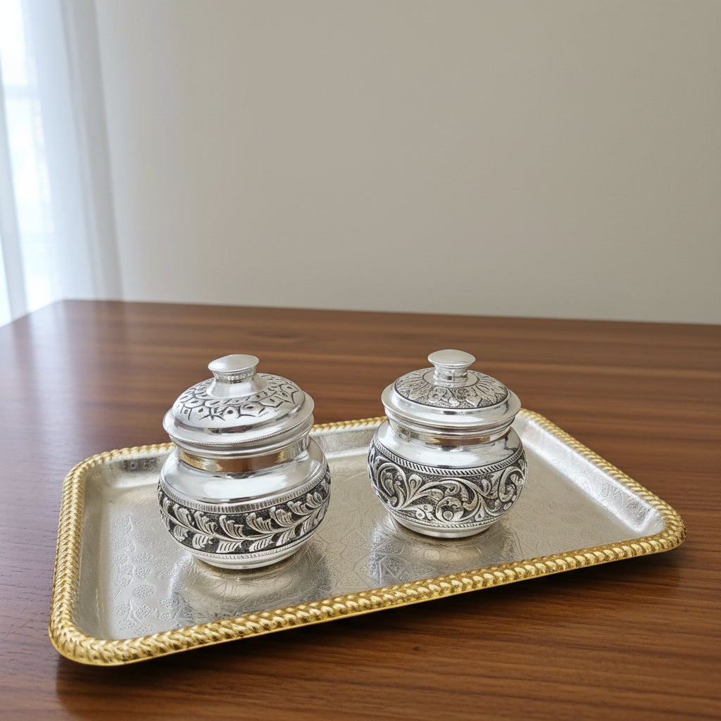 German Silver Tray with 2 Lidded Bowls – Antique Finish Pooja & Gifting Set for Dry Fruits or Offerings
