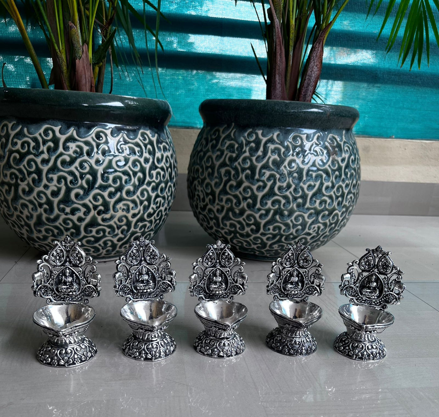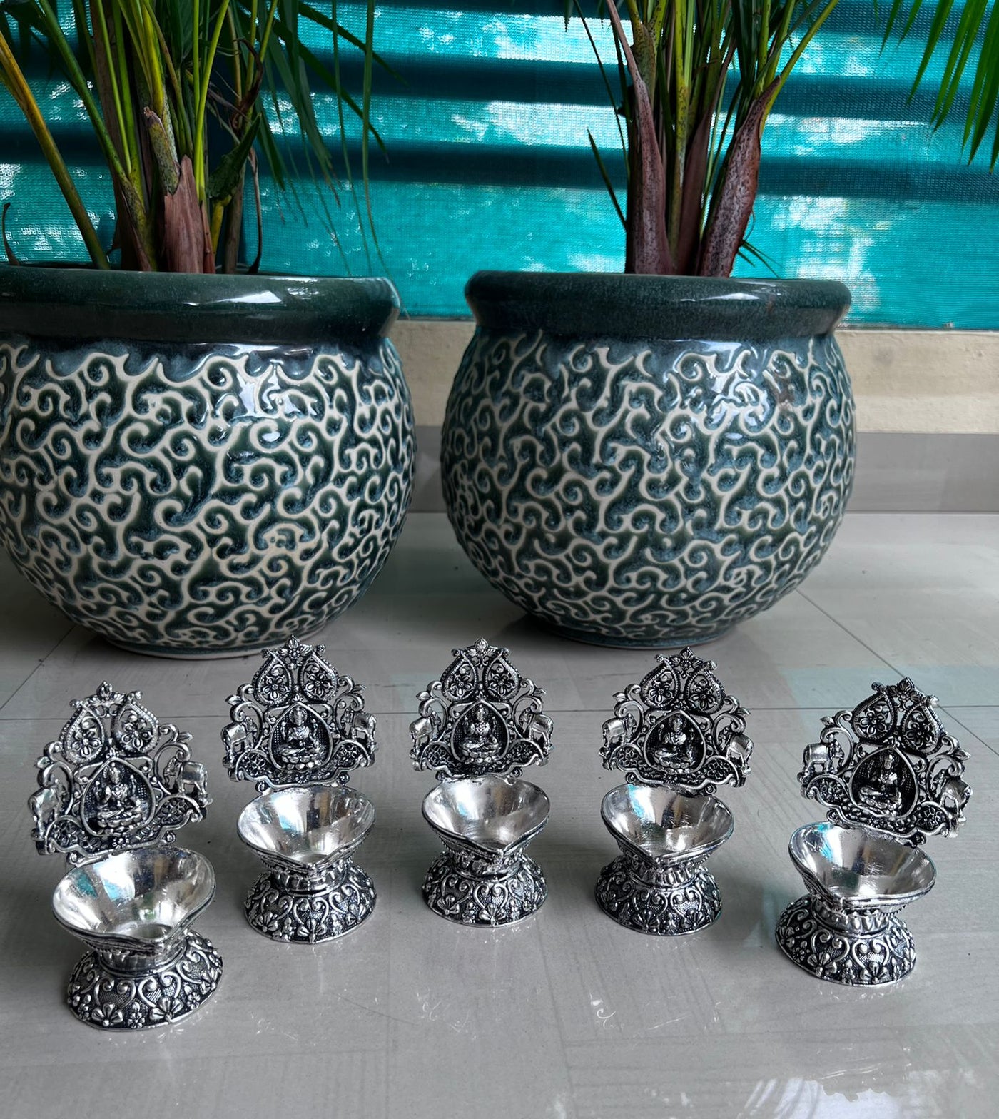 german silver antique finish lakshmi diya pair set for diwali/ housewarming
