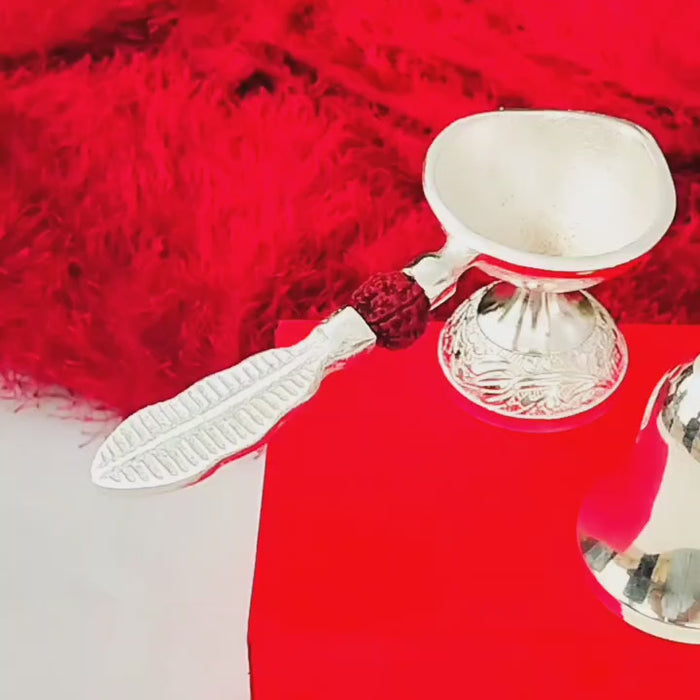 german silver rudraksha diya with bell with velvet box