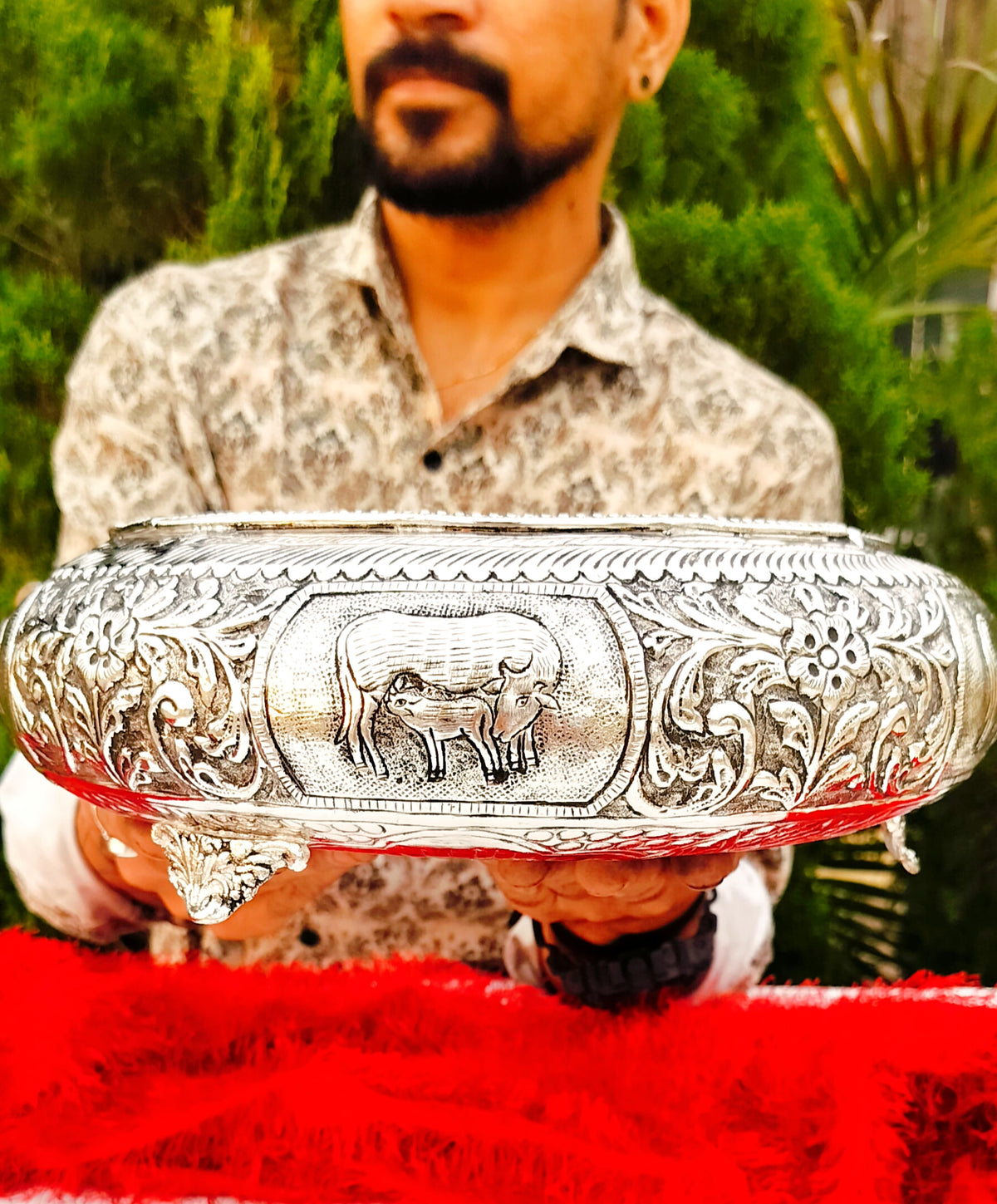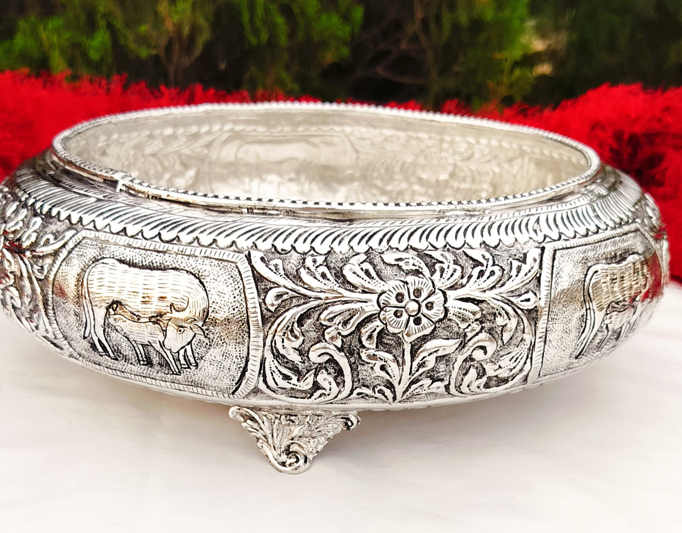 German silver cow and calf decorative bowl/urli with legs