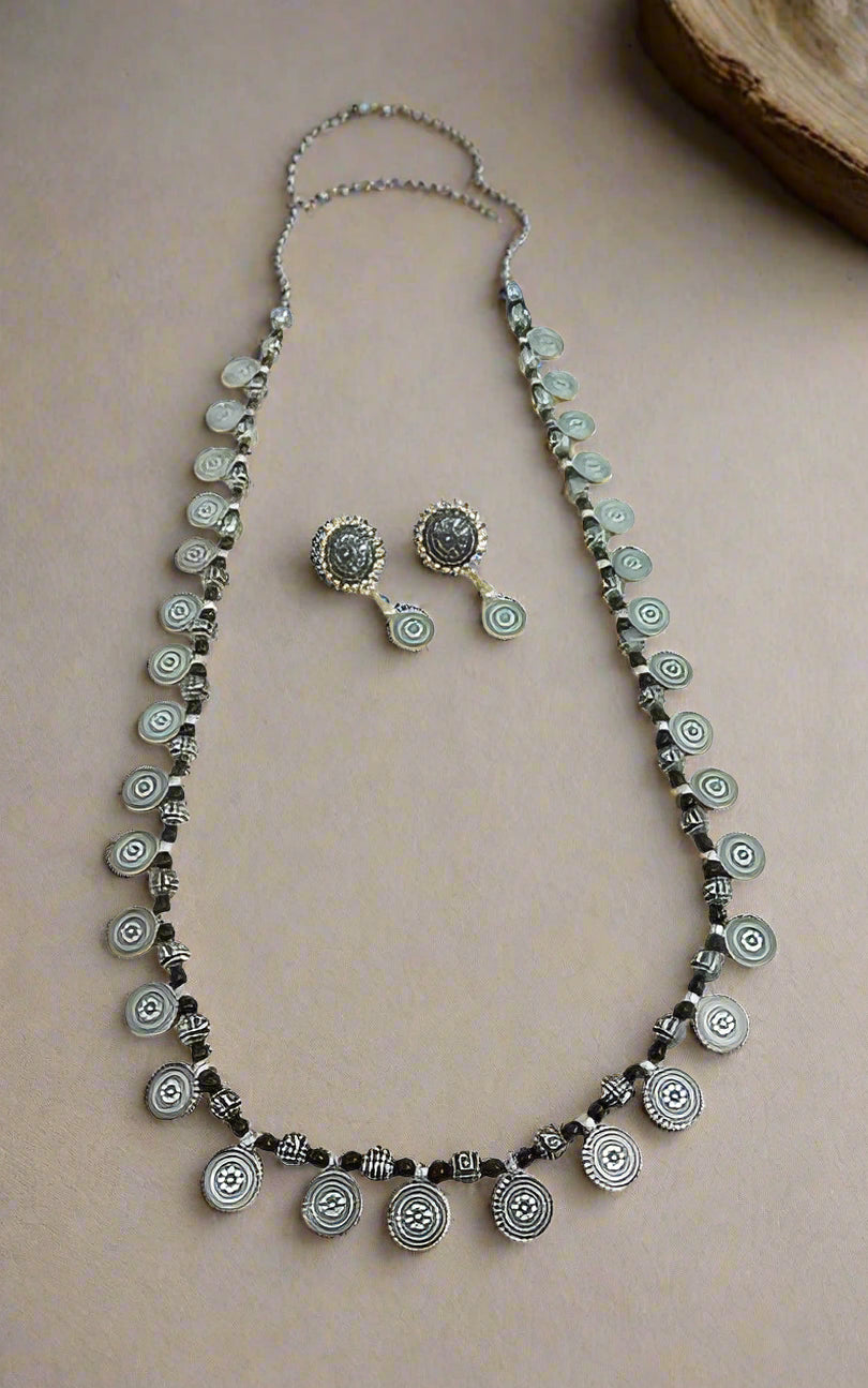 Long Oxidized Coin Beads necklace with matching earrings for women