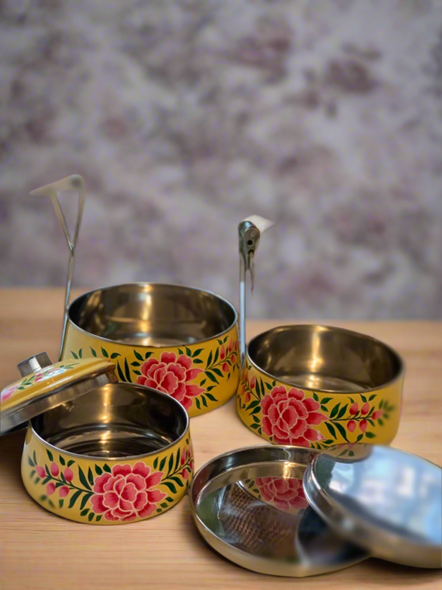 Hand-Painted 3-Tier Stainless Steel Lunch Box – yellow Design Eco-Friendly tiffin box 3 tier