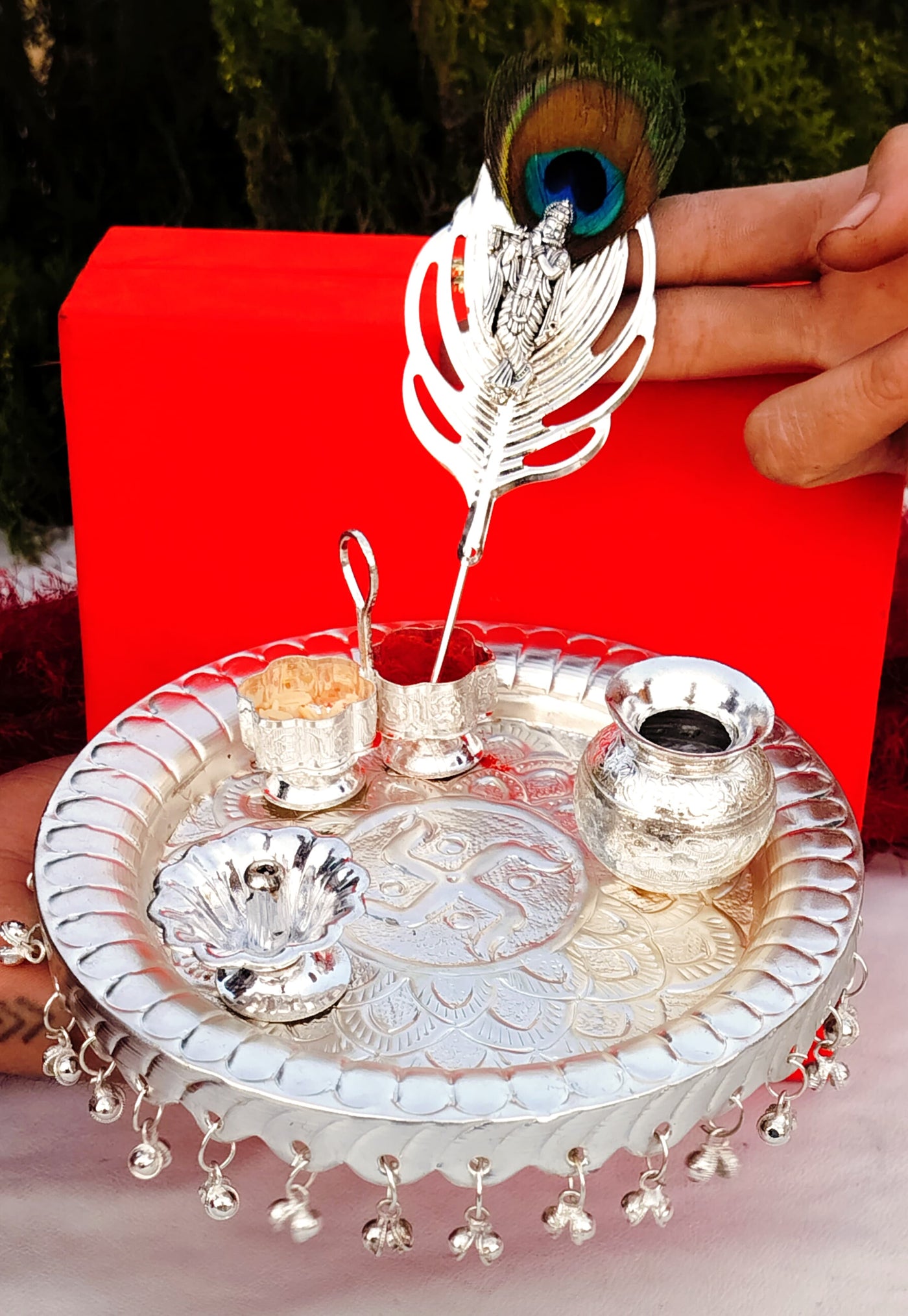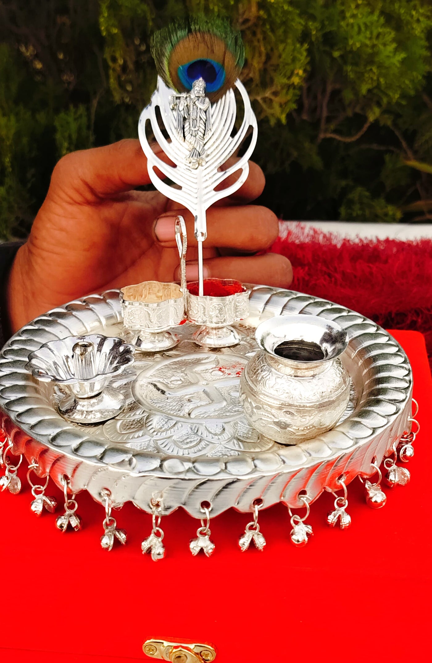 German silver Ghungaru aarti thali set with peacock feather flute Krishna Tilak stick