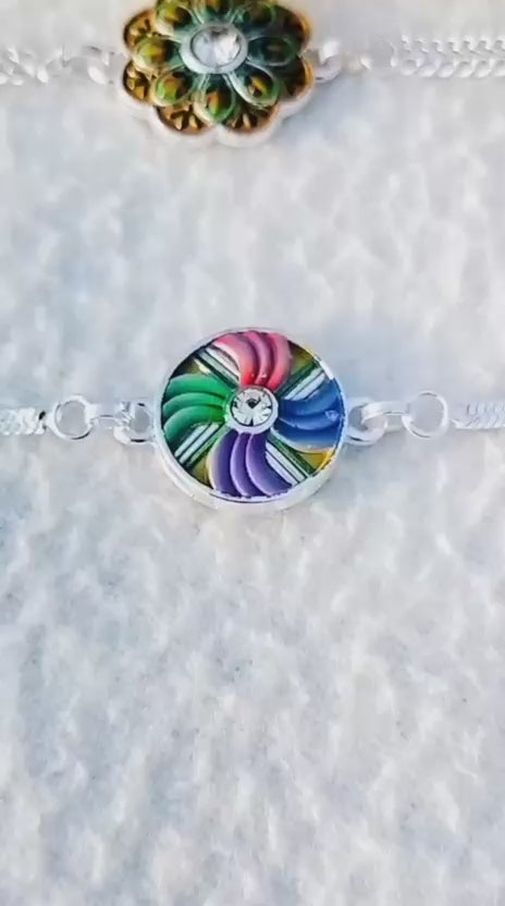German silver Ghungaru thali with peacock kumkum bowl & tilak stick with 2 pure silver rakhi set