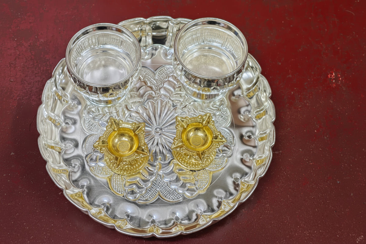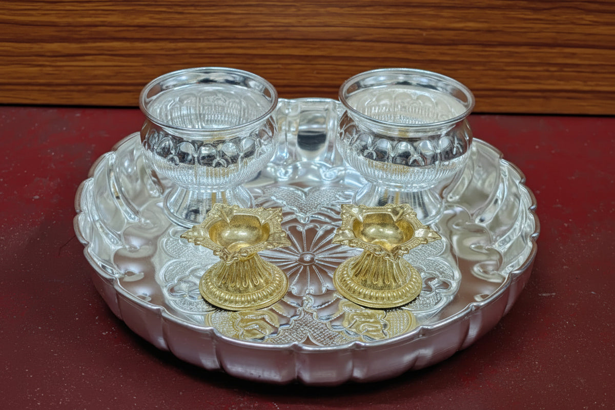 German Silver Pooja Thali Set – 5 Pieces for Housewarming, Festivals & Auspicious Ceremonies