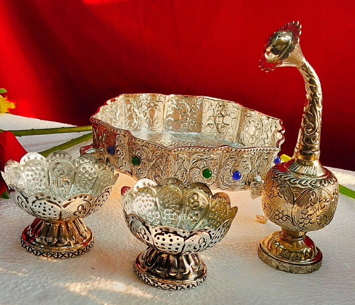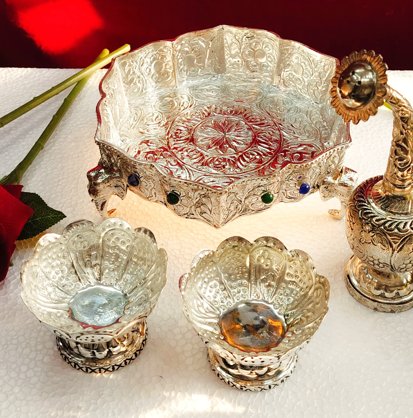 German Silver Antique Finish Tray/Stool with Elephant Legs Rose Dispenser Bowl