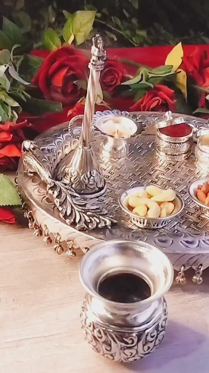 German silver Heavy gauge Antique design full Ghungaru peacock pooja set