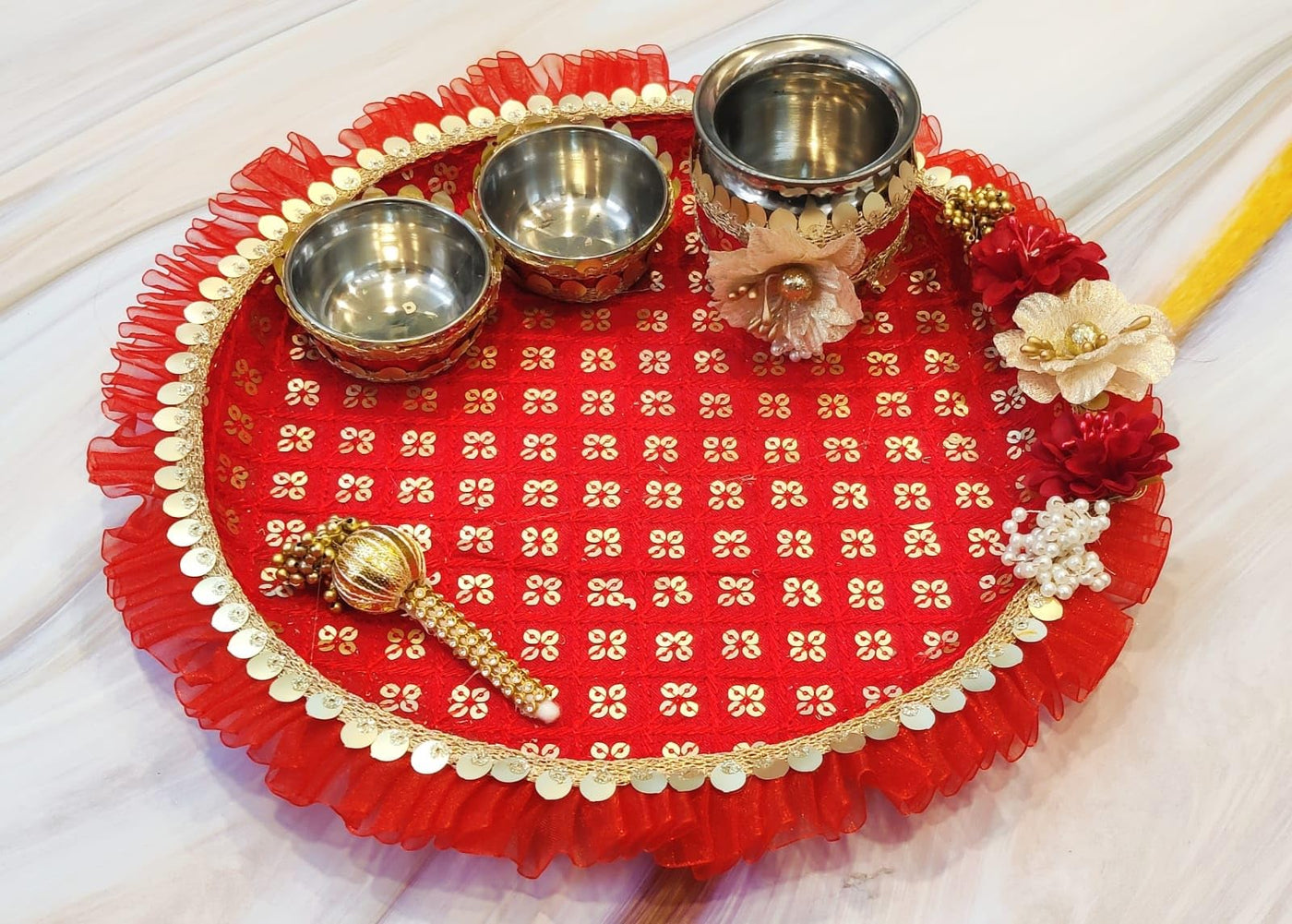 red Color Stainless Steel Pooja thali Set of 5 Pieces