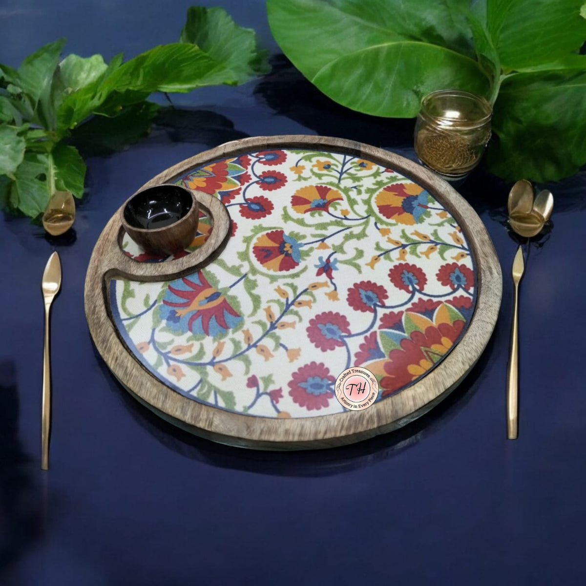 Beautiful Mango colorful mandala wood platter with chutney/ sauce bowl for snacks/ serving/ gift item