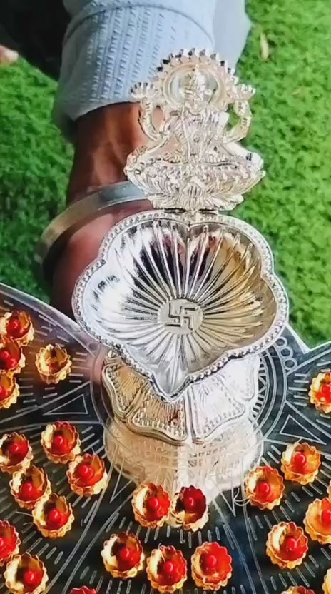 German silver lotus petals Ashtotram stand with 108 Golden red stone flower with lakshmi diya