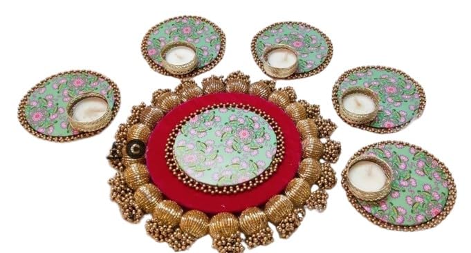 Green Pichwai Mat with Tea Light Holder Home Decor Set with Wax Tea Light for Floor/Table Decor