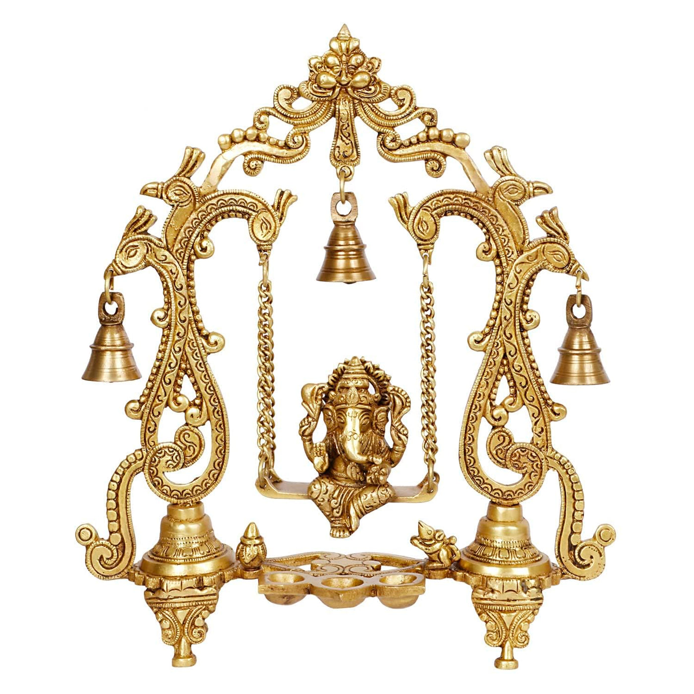 indiancraftsbykanika Brass Ganesh jhula/Swing with Diya for Home décor showpiece Idol Statue/Temple, Golden, 030124b