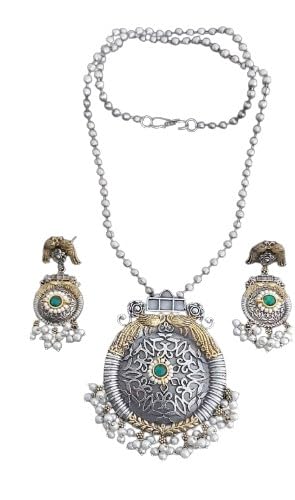 indiancraftsbykanika oxidized round pendant necklace with matching earrings for women