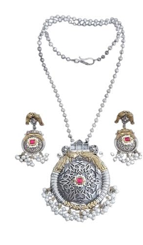 indiancraftsbykanika oxidized round pendant peacock design necklace with matching earrings for women