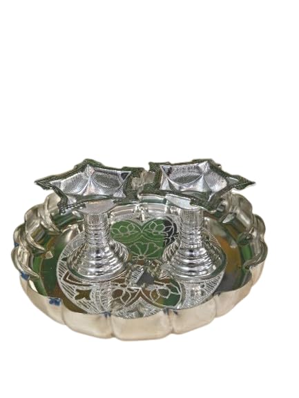 indiancraftsbykanika pure german silver flower plate with 2 diya set for diwali/housewarming