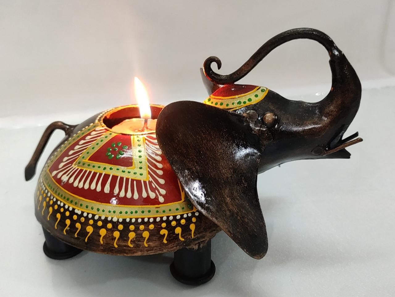indiancraftsbykanika Set of 2 Metal(Iron) Elephant Tea Light Holder with 10 Wax Tea Lights, Brown