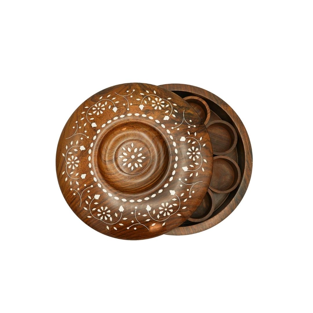 Wooden White Inlay Design 9 Compartment Masala/spice Box with Spoon and Lid