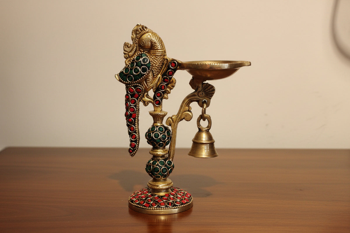 Set of 2 Brass Peacock Lamps with Stone Work – Elegant Home Temple Décor & Auspicious Gift